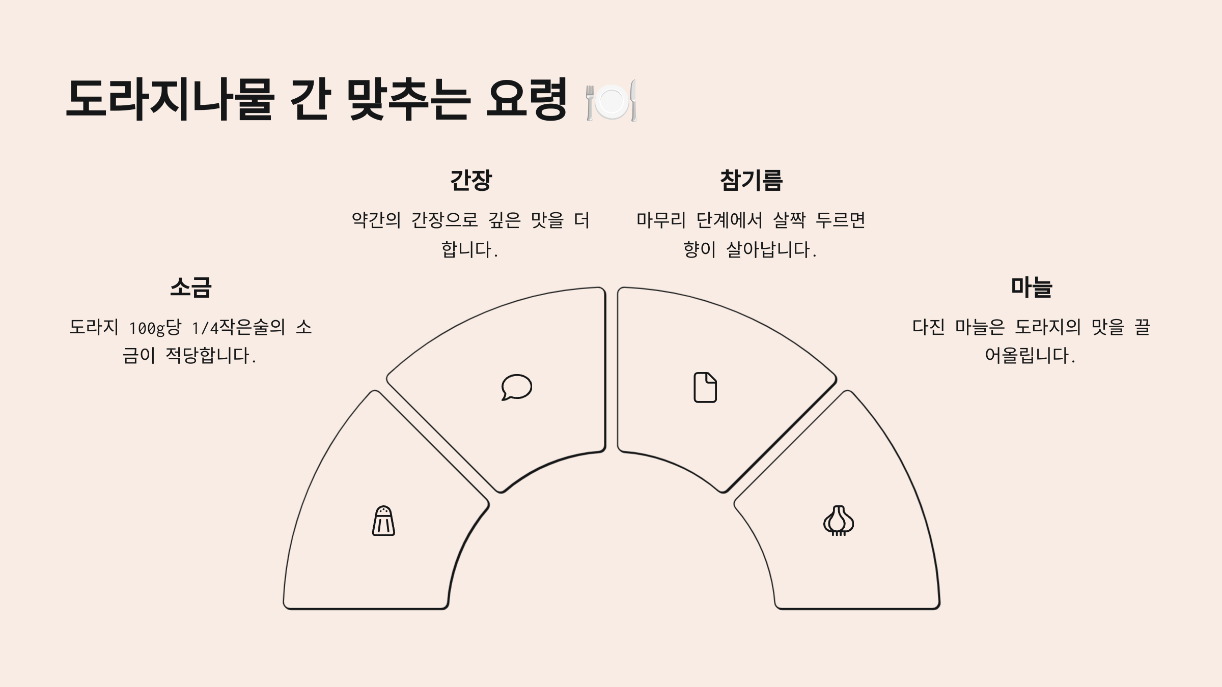 도라지나물의 맛을 좌우하는 건 바로 양념이에요! 도라지 특유의 향을 살리면서도 짜지 않게 간을 맞추는 게 중요하죠. 양념이 너무 강하면 향긋함이 묻히고, 너무 약하면 밍밍해져요. 적절한 비율이 바로 핵심이에요.