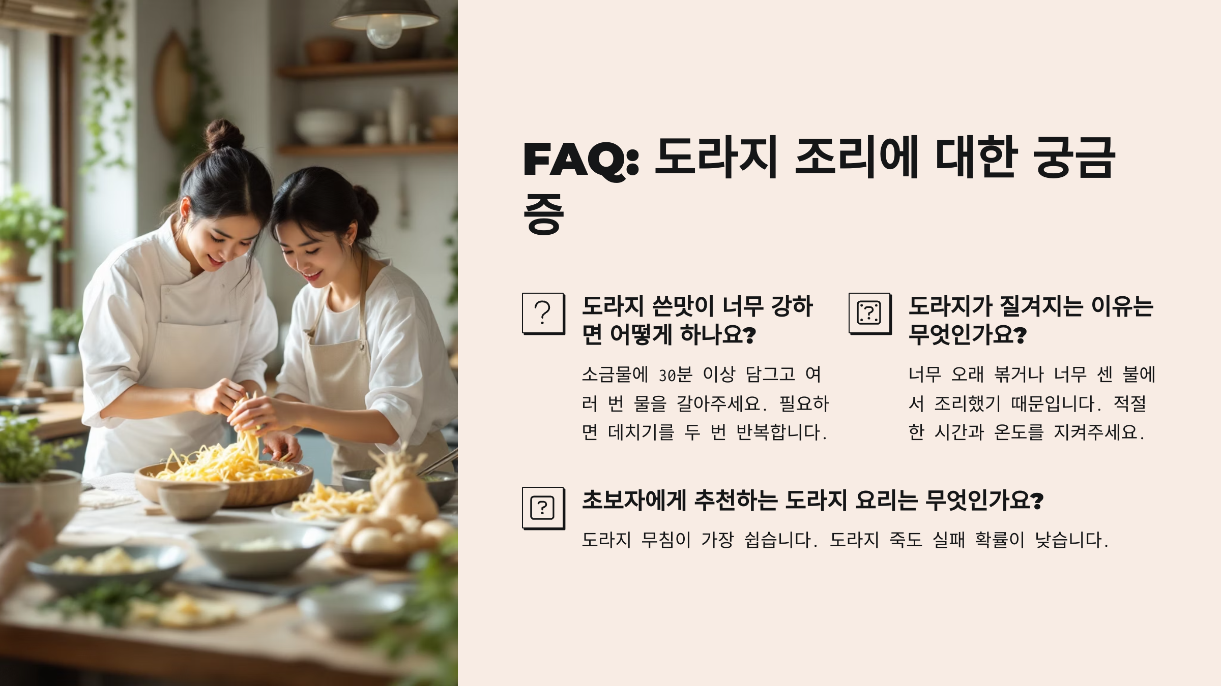 이렇게 도라지나물은 손질부터 볶기, 보관, 활용까지 전 과정을 알면 정말 다양한 방식으로 즐길 수 있어요. 이젠 명절이나 평소 반찬 걱정 없이 뚝딱 만들 수 있겠죠? 😊 다음은 자주 묻는 질문들을 모아봤어요!👇