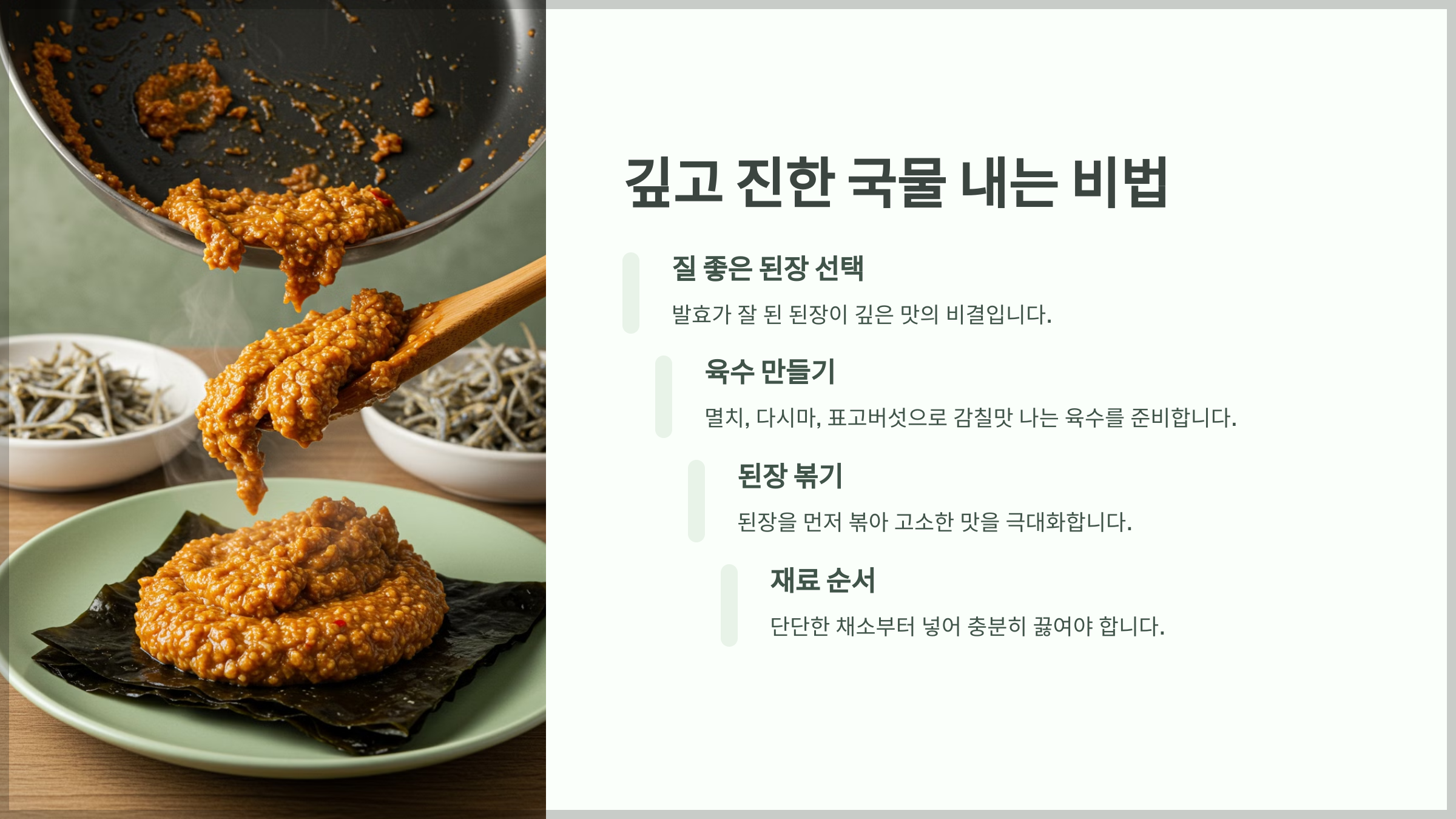 이제 된장찌개의 핵심 재료를 알았으니, 깊고 진한 국물을 내는 비법도 살펴볼까요? 😊