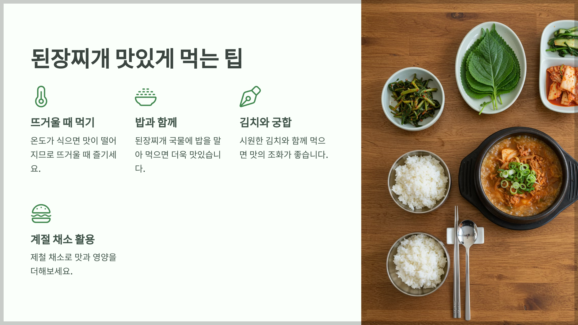 이제 다양한 스타일의 된장찌개를 알아봤어요! 그렇다면 된장찌개를 더욱 맛있게 먹는 팁도 살펴볼까요? 🤩