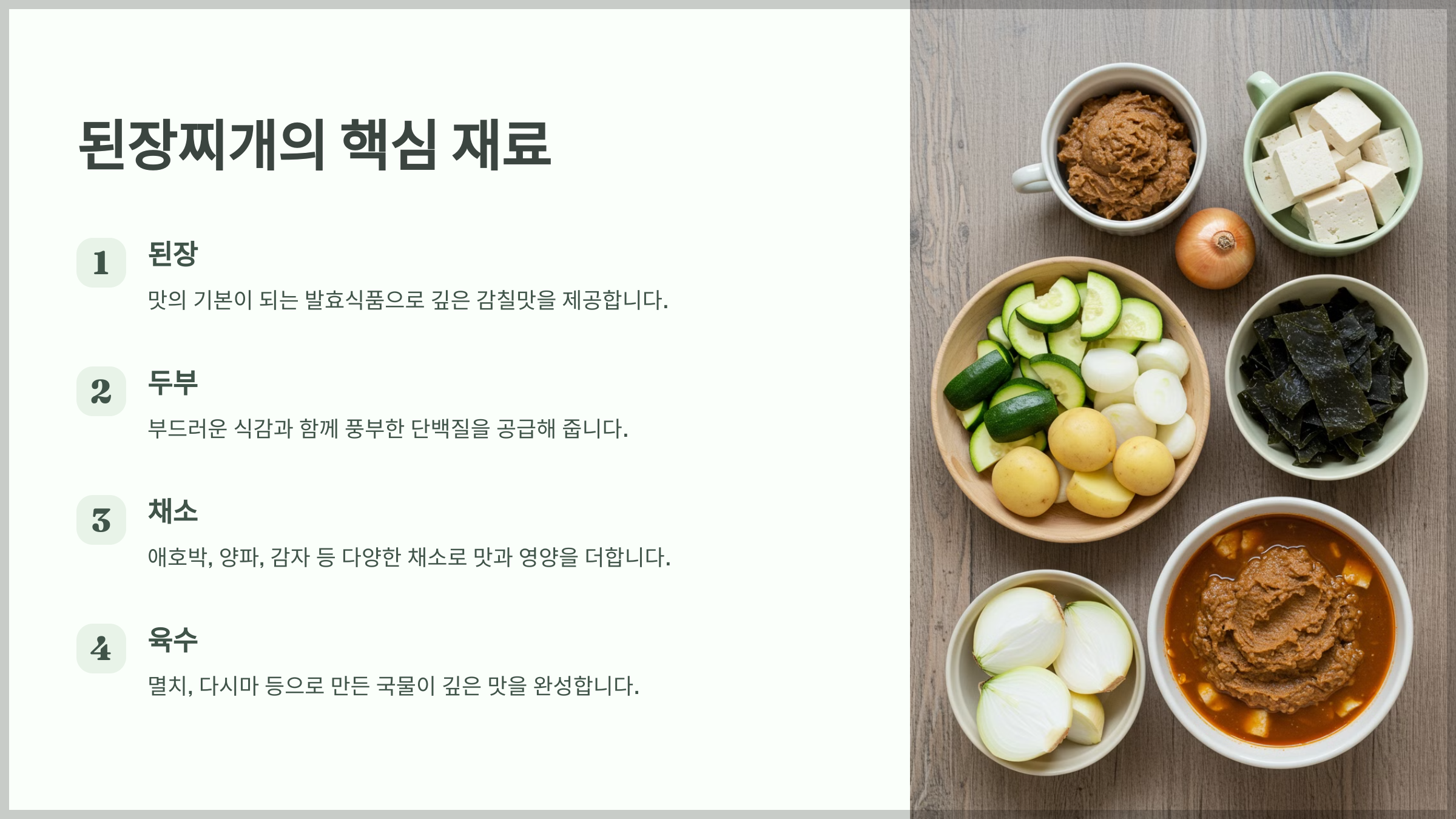 이제 된장찌개의 종류를 알았으니, 맛을 결정하는 핵심 재료들도 살펴볼까요? 😊