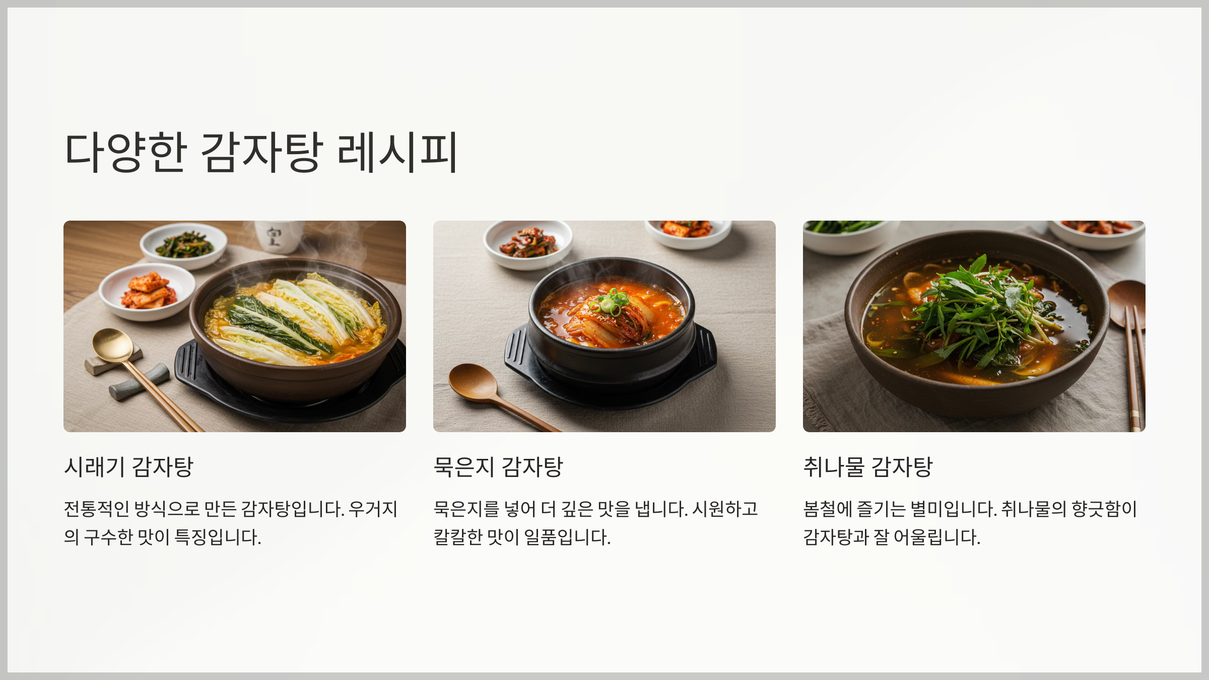 | 구수한 감자탕 | 된장 베이스로 깊은 맛 | 된장, 들깨가루, 우거지 |