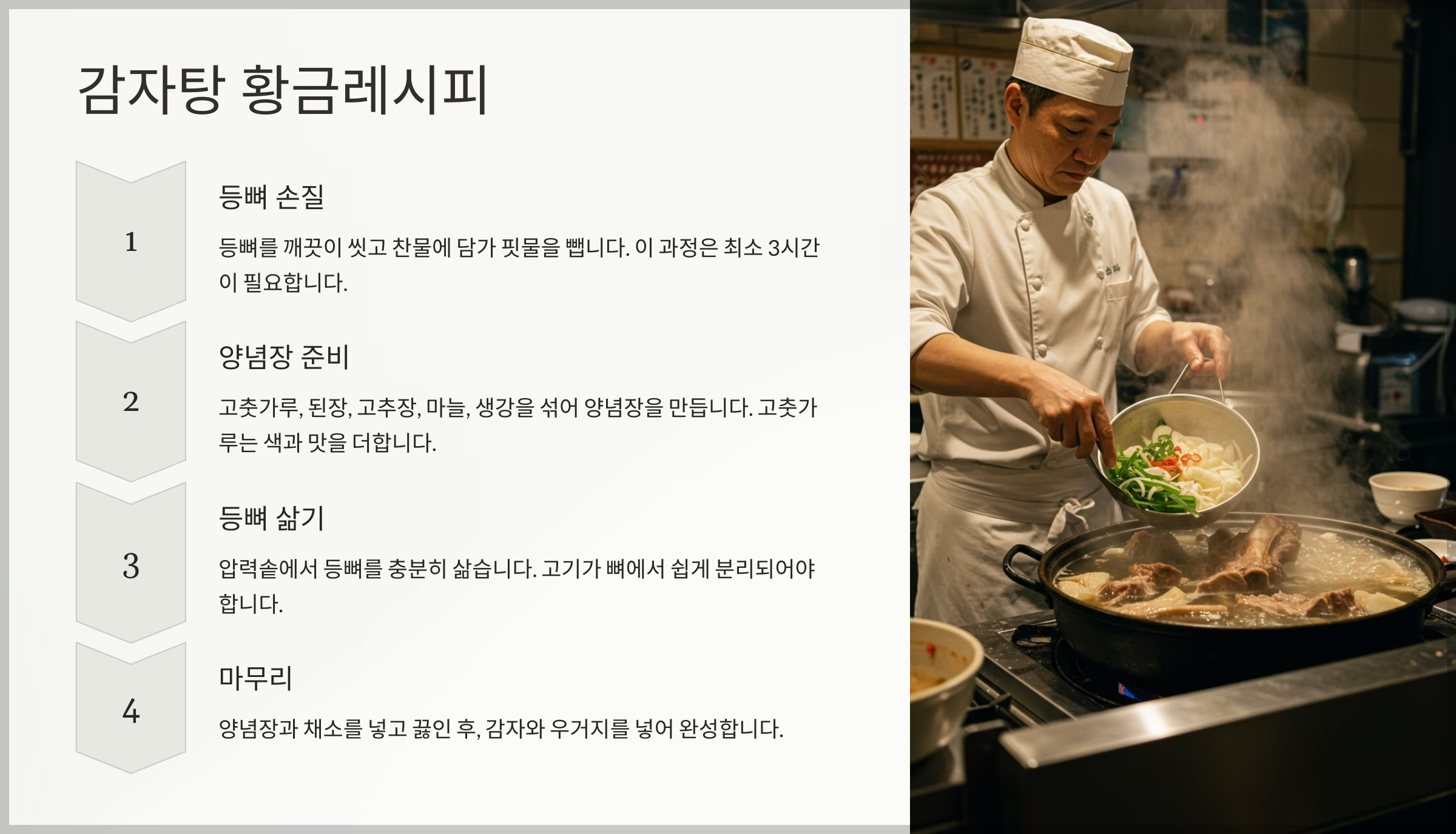 이제 부드러운 등뼈를 완성했으니, 본격적으로 감자탕을 맛있게 만드는 황금 레시피를 알아볼까요? 🍲