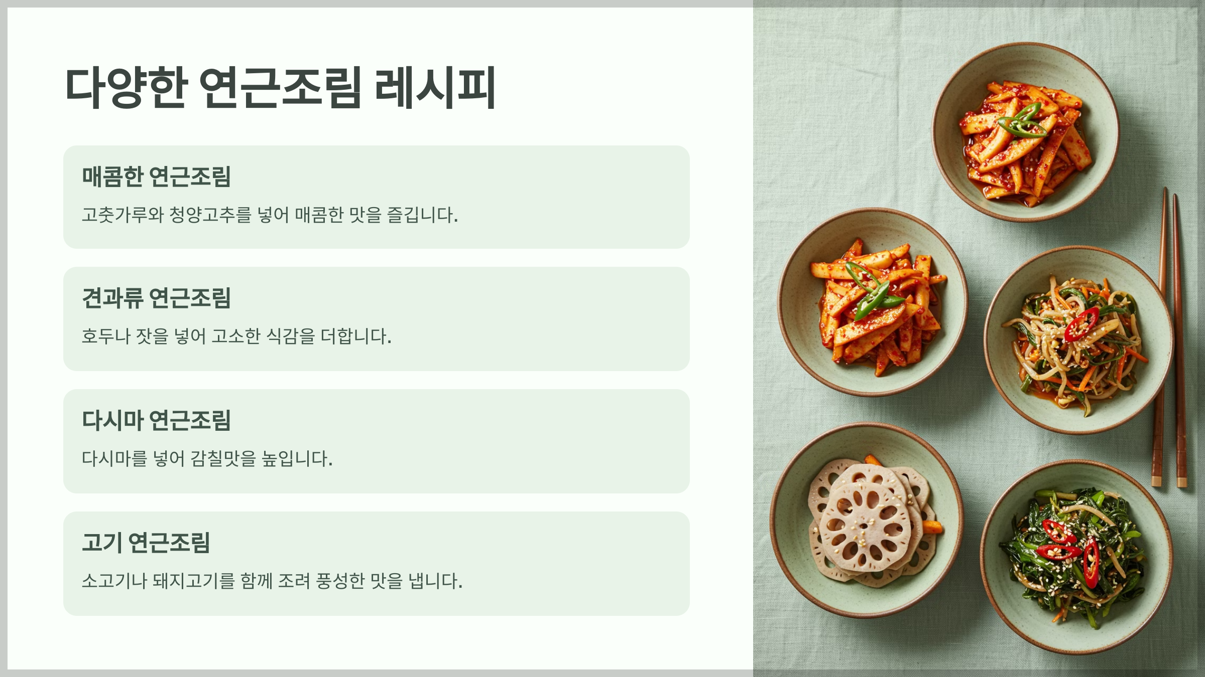 | 견과류 연근조림 | 고소한 풍미 추가 | 호두, 아몬드 |