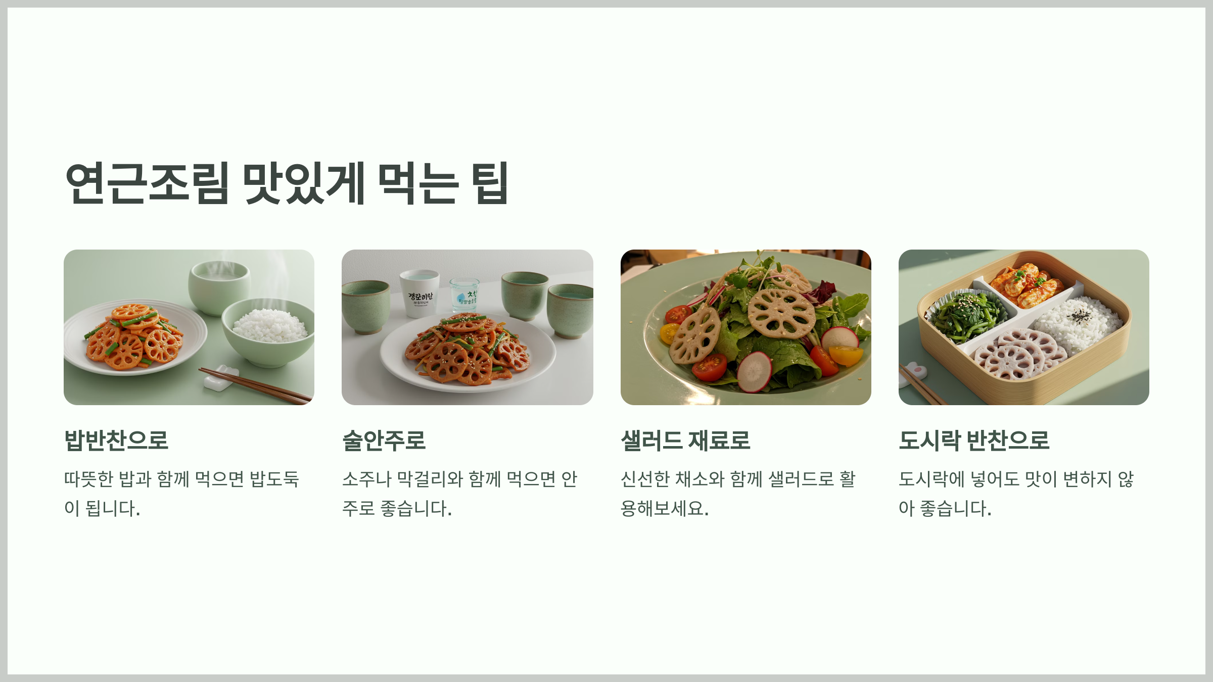 연근조림은 그냥 먹어도 맛있지만, 다양한 음식과 함께하면 더욱 풍미가 살아나요. 밥반찬으로도 좋고, 샐러드나 샌드위치에 활용하면 색다른 맛을 즐길 수 있답니다!