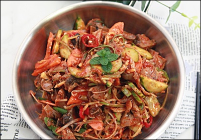 - 채썰어 둔 양파, 오이, 당근을 넣고 남은 양념을 넣어 가볍게 섞어요.