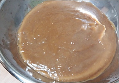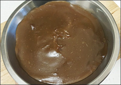 - 반죽이 윤기가 나고 탄력이 생기면 불을 끄고 틀에 부어요.