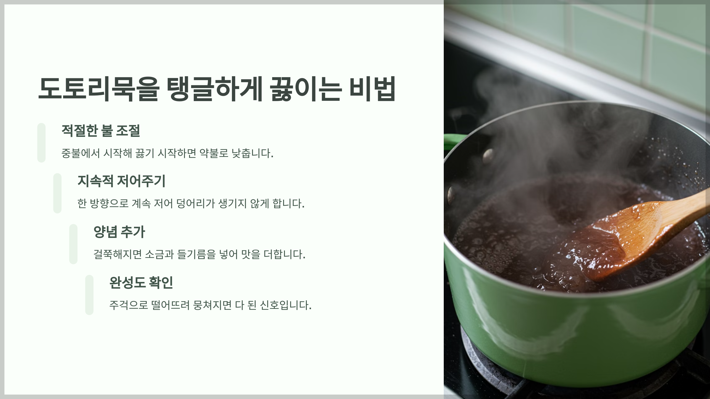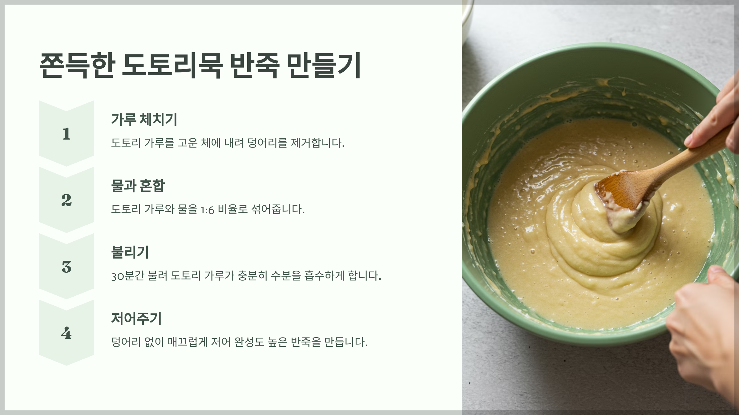 내가 생각했을 때 도토리묵의 핵심은 반죽 농도와 끓이는 과정이에요. 이 두 가지를 제대로 하면 탄력 있는 도토리묵을 만들 수 있어요! 💡