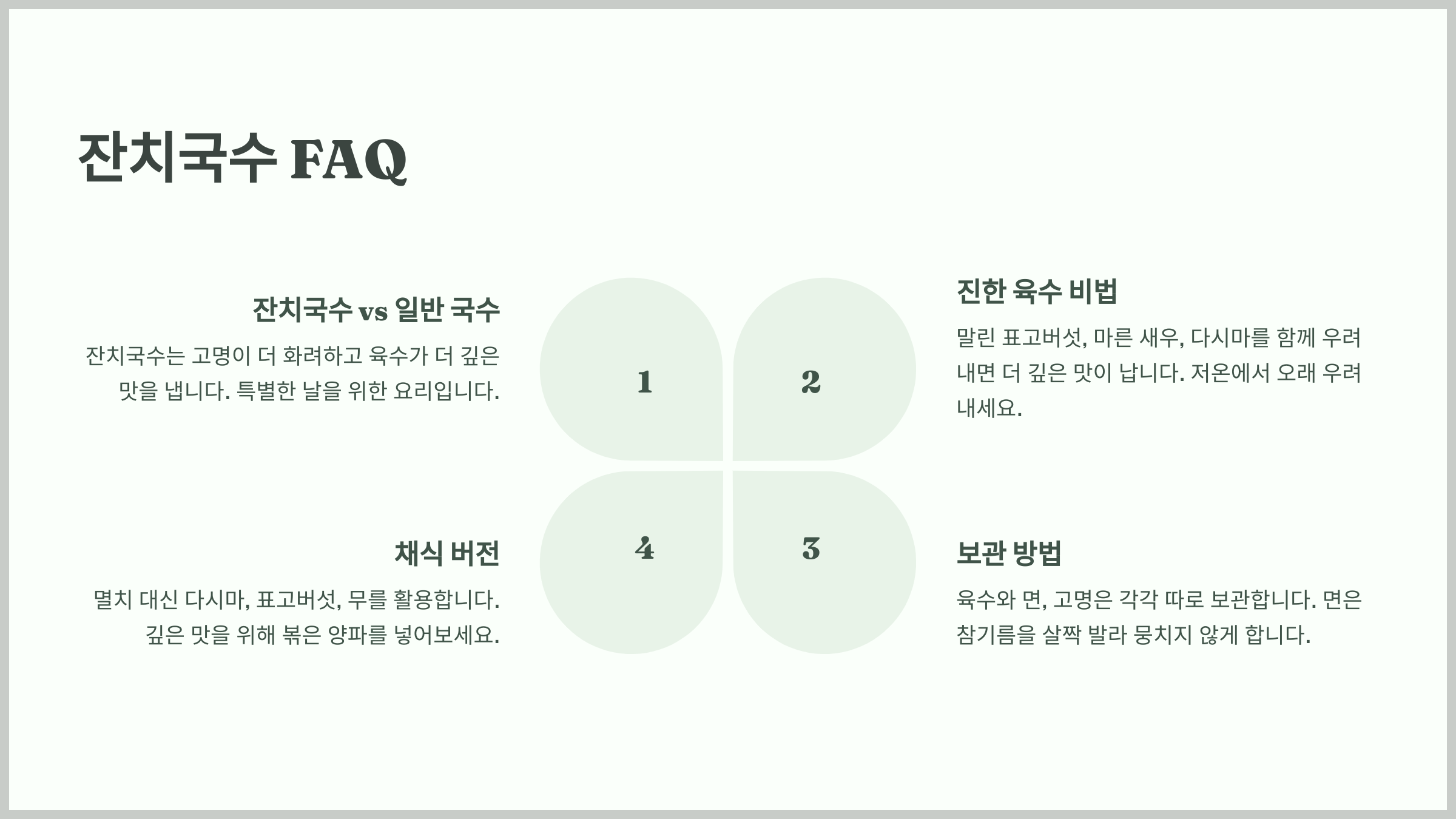 이제 잔치국수를 더욱 맛있게 즐길 준비가 끝났어요! 마지막으로, 잔치국수에 대한 궁금증을 해결해 줄 FAQ를 확인해볼까요? ⏬