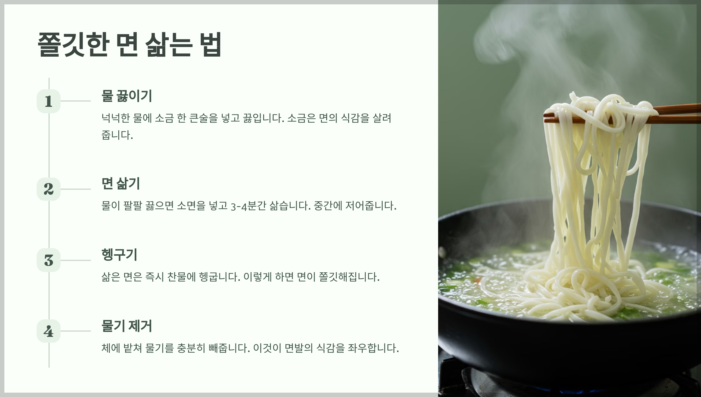 - 면을 삶은 후 찬물로 충분히 헹궈야 전분이 제거되고 쫄깃한 식감이 살아나요.